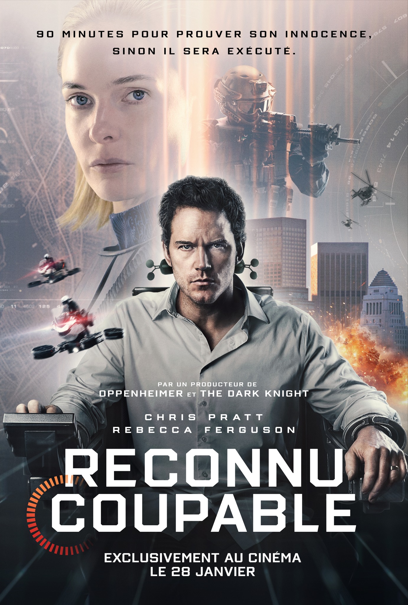 Résumé : Dans un avenir proche, un détective se retrouve devant un tribunal, accusé d'avoir tué sa femme. Il a seulement 90 minutes pour convaincre une juge dotée d'une intelligence artificielle sophistiquée (Rebecca Ferguson), qu'il avait jadis défendue, de son innocence avant qu'elle ne rende son verdict...